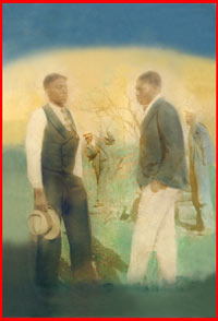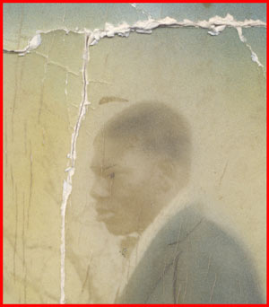 | Since the original was oval shaped, the CLONE tool was used to enlarge the image to a rectangular shape, giving the client more matting options. The CLONE tool was also used to eliminate the large stains. The CONTRAST was selectively increased to bring out the two persons in the background. Someone had taken ink and drawn in pupils for the two foreground persons but this look unnatural. One of the pupils was inked in at the wrong place in the eye. These ink marks were removed with the CLONE tool and the pupils were were re-done with a softer brush to match the overall look of the image. The image was completed with a judicious use of the UNSHARP MASK filter. |