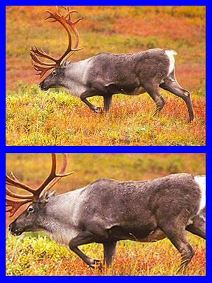Illustration A In Illustration A, the image circle is being projected by a 400mm lens that is designed to "cover" the sensor of a "full frame" DSLR or the film window of a 35mm camera. The larger blue rectangle represents the full frame DLSR sensor/35mm film window and the resulting photo. When you put the same 400mm lens on a DSLR with a field of view crop, the image circle projected by the lens is exactly the same size, BUT the sensor records a smaller area of the image. In the illustration above, the smaller blue rectangle represents a digital sensor with a 1.6x FOV crop. Since the digital sensor records a smaller portion of the same image circle, the caribou looks closer. It looks like you took the photo with a 640mm lens (Illustration B). This is what gives rise to the phrase magnification factor. |