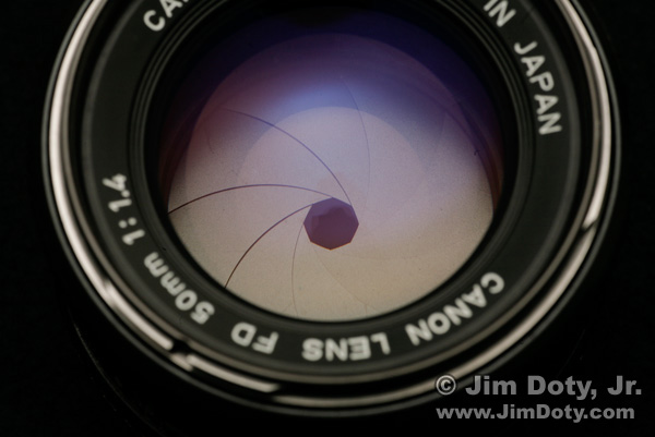 The size of the aperture opening is indicated in "f-stops" (or "f stops"). In the case of the photo above, the aperture is set to f/8. "f-stops" are the ratio of the diameter of lens opening to the focal length of the lens. If the diameter of the aperture opening is 25mm and the focal length of the lens is 50mm, the f-stop or "focal ratio" of the lens is 25:50 or 25/50 or 1/2 so the f-stop is written f/2. As long as you remember that f -stops are actually fractions (the reason for the "/") with the number one on top, it will be easy to remember that f/2 (1/2) is a very wide lens opening and f/16 (1/16) is a very small lens opening. 1/2 a piece of pie is a lot more than 1/16 of a pie. In the photo below, the f-ratio of the maximum aperture is written as "1:1.4" which is the same as 1/1.4 or f/1.4. Here is the same lens set to f/2, a very wide aperture.