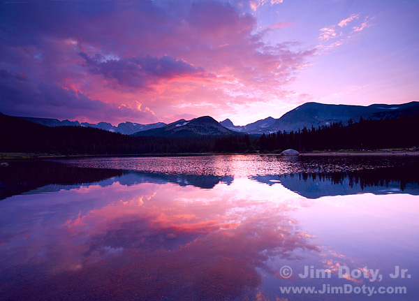 Brainard Lake, Indian Peaks Wilderness, Colorado I was at Brainard Lake at the entrance to the Indian Peaks Wilderness, hoping to capture a beautiful sunset. The sky was overcast with occasional drizzle, so I contented myself with a few flowers closeups. It started to get darker and I knew the sun was setting, but there wasn't even a hint of sunset color. Just flat gray sky. But photography is partly about patience and I've learned from past experience that you can occasionally get a second sunset, even if the first sunset doesn't show up. The first sunset is when the sunlight hits the clouds that you can see. The second sunset is when sunlight hits clouds beyond the horizon that you can't see, bouncing some light back onto the clouds you can see. So I sat in the car out of the chilly drizzle, warmed up, ate a snack, waited and hoped. The drizzle stopped and the clouds began to part. Faint colors started showing up and I was out of the car and setting up my tripod. The colors intensified but only for a few minutes. The light levels were low, but a tripod allowed me to use a low ISO and a longer shutter speed for maximum image quality. As quickly as they came, the colors faded and the show was over. You won't always get wonderful, late light, but you won't know unless you wait around and see! Brainard Lake is just a short drive west of Ward, Colorado. Red Rock Lake is along the road to Brainard Lake and Long Lake is just a short hike from the Brainard Lake Road. Trails from Brainard Lake will take you to other beautiful locations in the wilderness area. There is a small entrance fee. Exposure Data: Canon 5D, 17mm lens, f/8, 1/6 second, ISO 100.